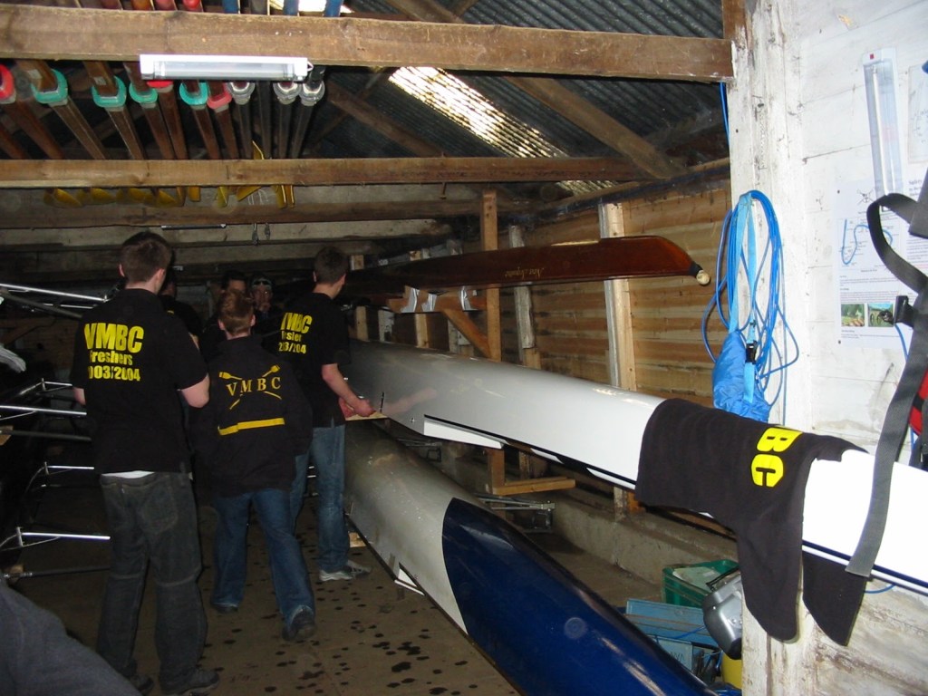 Open the wooden double doors and the prows of rowing boats old and new greeted the oncomer; an array of bow balls. An old-but-serviceable fibreglass Aylings sat on wheeled dollies, accompanied by the new-in-2004 George Patterson, the lightweight wooden Temptress, two single sculls, a venerable double called Non Sequitur and two other wooden fours. High in the rafters sat an array of bright yellow blades – VMBC boats were visible from afar.